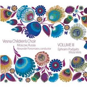 The “Vesna” Children’s Choir of Moscow, comprised of 50 select voices ages 6 to 14, is undoubtedly one of the best children’s choirs in the world. Their singing is fully professional, artistic, polished—outstanding in every respect! Unlike the “showcase socialist” institutions of the Soviet era, this choir exists as a private “cooperative” music school, run jointly by the children, their families, and the staff. Since their founding, however, they have received official support and recognition from the Russian government. The music on this album, Ephrem Podgaits’ (b. 1949) Spring Mass, a Latin setting of the Roman Catholic Mass for choir and organ, which premiered in 1997. Although it presents the Mass elements in a somewhat non-traditional order (e. g., Sanctus, Agnus, Benedictus, Kyrie, etc.), this is clearly a piece that represents a major addition to the concert Mass repertoire.